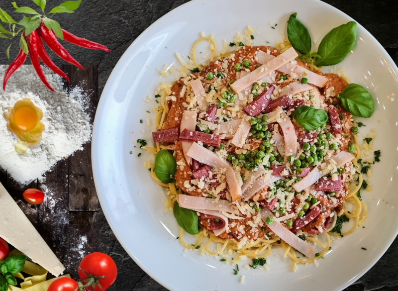 mit Napolisahnesauce, Salami, Puten und Erbsen WE,EI,Mi,SO,FI ,2,3,9,17